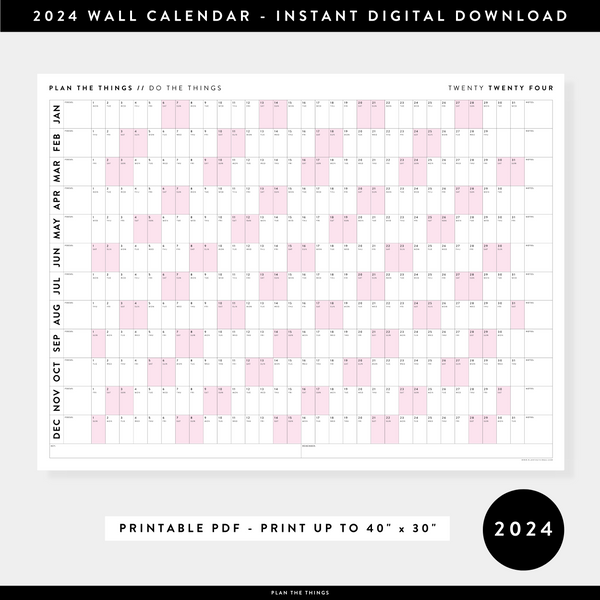 PRINTABLE HORIZONTAL 2024 WALL CALENDAR WITH PINK WEEKENDS